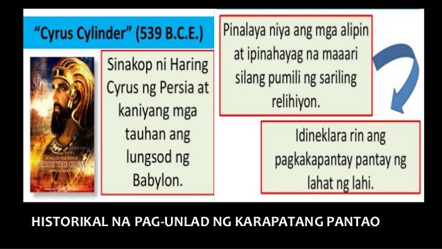 Ibat iba ang pakahulugan at pananaw ng bawat isa sa karapatang pantao. Sa panahon ngayon nakatatak na sa ating mga isipan ang salitang pandemya. Poltikal Sosyal kultural Historikal ng Pagunlad ng konsepto ng Karapatang Pantao Cyrus Cylinder 539 BCE Sinakop ni Haring Cyrus ng Persia at kaniyang mga tauhan ang lungsod ng Babylon.