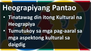 Home Heograpiyang Pantao. Heograpiyang pantao pag-aaral sa mga aspektong kultural na matatagpuan sa daigdig wika tanda ng kultura. Mangabuddy April 15 2022.