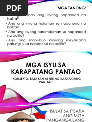 Naipapaliwanag ang ibat ibang karapatang pantao hango sa mga nagaganap sa isyu at hamong panlipunan. Ito ay ang mga karapatang likas sa lahat ng tao maging ano man ang kaniyang lahi pinagmulan kasarian kulay relihiyon salita at iba pa. Karapatang panlipunan karapatan upang mabuhay ang tao sa isang lipunan at upang isulong ang kanyang kapakanan karapatang pangkabuhayan karapatan ukol sa pagsusulong ng kabuhayan at disenteng pamumuhay karapatang kultural karapatang ng taong lumahok sa buhay kultural ng pamayanan at magtamasa ng siyentipikong pag-unlad ng pamayanan.