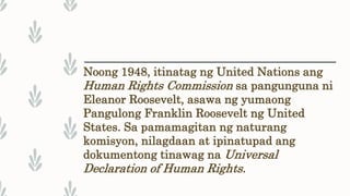 Ang karapatang pantao ay isang bagay na likas sa iyong sariling pag-iral na nakuha mula sa kapanganakan sa ibat ibang antas. 1948 at binansag an ito. The Universal Declaration of Human Rights 1948 Isinusulong nito ang pagkakapantaypantay ng lahat ng tao sa karapatan na maging malaya at maging ligtas sa anumang uri ng diskriminasyon.