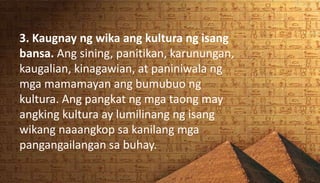 Mapagnilayan ang ibat-ibang pangkat etniko sa. Itinuturing bilang kaluluwa at salamin ng isang kultura ang wika. MGA LAHI a MONGOLOID 8.