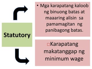 -Karapatan sa Pag-aari -Karapatan sa Pagkuha ng mga Pribadong Pag-aari -Karapatan sa dignidad na pantao sa pagkakapantay-pantay na panlipunan pangkabuhayan at pangkalinangan -Karapatan sa Edukasyon sa lahat ng antas. Ang karapatang panto ay tumutukoy sa karapatan at mga kalayaang nararapat na matanggap ng lahat ng tao. ANG PAGMAMAHALNG ISANG INA.