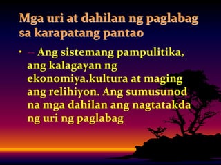 Extrajudicial Killing Ang ibig sabihin ng sapilitang paggawa ay ang pamimilit sa tao na magtrabaho gamit ang dahat at pananakot. Ang mga karapatang pantao ay nalalabag batay sa mga naitatag nang mga batas gaya ng. Piling Akda hinggil sa Karapatang Pantao Aralin 1.