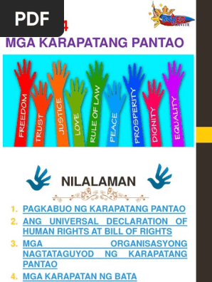 28102019 Ang mga karapatang pantao o human rights ay ang mga payak na karapatan at kalayaan na dapat makamit at maisabuhay ng isang tao o indibidwal. Ayon kay Gascon ang karapatang pantao ay mga binuong pamantayan kung saan tinatawag ang lipunan na respetuhin at sundin. Sa pagtindi ng pandaigidigang krisis sa ekonomiya tumitindi rin ang panunupil at paglabag sa mga karapatang pantao ng mga mamamayan ng mundo.