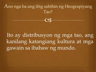 Ano ang SAKLAW ng pag-aaral ng Heograpiyang Pantao. Heograpiyang Pantao 1. Email ThisBlogThisShare to TwitterShare to FacebookShare to Pinterest.
