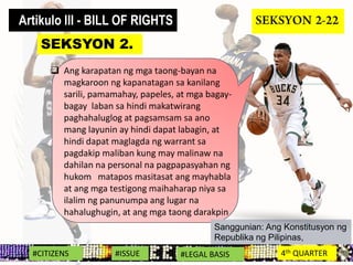 1 Nililikha sa pamamagitan nito ang isang malayang tanggapan na tatawaging Komisyon sa mga Karapatang Pantao. CITIZENS ISSUE LEGAL BASIS 4 th QUARTER ito ay isang pambansang grupo ng mga human rights lawyer na nagtataguyod at nangangalaga ng mga karapatang pantao.
