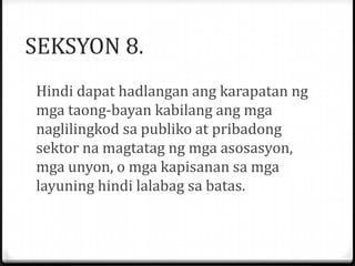 ARTIKULO 1 Karapatan sa pagkakapantay-pantay ARTIKULO 2 Kalayaan mula sa diskriminasyon o pagtatangi ARTIKULO 3 Karapatan sa buhay kalayaan at seguridad ARTIKULO 4 Kalayaan mula sa pang-aalipin ARTIKULO 5. Karapatan sa seguridad ng lipunan. Ito ang nagbigay-proteksiyon sa mga karapatang pantao ng lahat ng mamamayan at maging ang iba pang taong nanirahan sa bansa.
