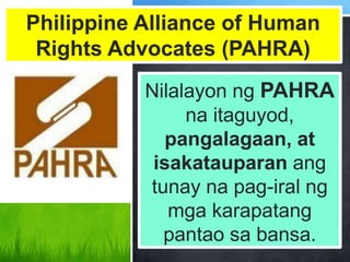 3- Simon Wiesenthal Center. Philippine Alliance of Human Rights Advocates PAHRA itinatag ang alyansang ito noong 1986 at nilahukan ng mahigit sa 100 organisasyon mula sa ibat ibang bahagi ng bansa.