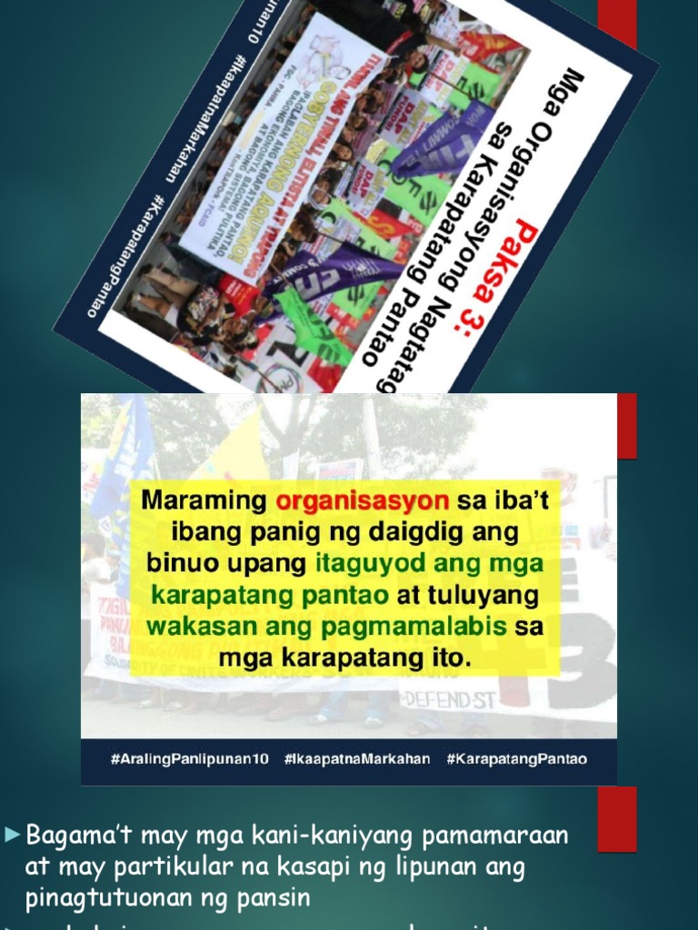 Libu-libong magsasaka at katutubong mamamayan mula sa Mindanao at Timog Katagalugan kasama ng ibat ibang sektor mula sa Kamaynilaan ang nagmartsa sa Mendiola noon mismong Pandaigdigang Araw ng Karapatang Pantao para ipanawagan sa administrasyong Aquino na itigil na ang mga paglabag sa mga karapatan ng mga mamamayan. Ang ebolusyon ng kilusang karapatang pantao ay malinaw na naglalarawan ng patuloy na pakikibaka ng. Close suggestions Search Search.