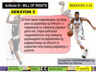 Binigyang-diin ng Estado ang pahayag na ito sa Katipunan ng mga Karapatan Bill of Rights na nakapaloob sa Seksyon 1 - 22 ng Artikulo III. CITIZENS ISSUE LEGAL BASIS 4th QUARTER KARAPATAN G PANTAO MGA HALIMBAWA NG KARAPATANG PANTAO. Hindi dapat alisan ng buhay kalayaan or ari-arian ang sino mang tao nang hindi kaparaanan ng batas ni pagkaitan ang sino mang tao ng pantay na pangangalaga ng batas.