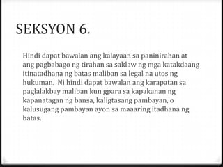 Saligang Batas ng 1987 Karapatan Sa Halal Artikulo V Seksyon 2 Masiguro ang pagiging sekreto at sagrado ng mga balota at gayon din ng isang sistema para sa pagbotong liban ng mga kwalipikadong Pilipino na nasa ibang bansa. Saklaw ng tao ang kaniyang mga karapatan sa aspektong sibil poltikal ekonomikal sosyal at kultural. KARAPATANG PANTAO Taglay ng bawat tao ang mga karapatang nakabatay sa prinsipyo ng paggalang sa isang indibiduwal.