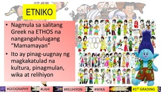 Heograpiyang Pantao from Congressional National High School Gawin ang gawain na ito. MELC-BasedNapahahalagahan ang natatanging kultura ng mga rehiyon bansa at mamamayan sa daigdig lahi pangkat- etnolingguwistiko at relihiyon sadaigdig. HERE maraming mga isinalin.