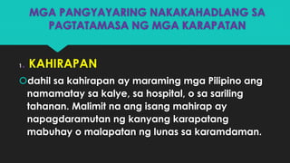 Ang mga karapatang pantao human rights sa Ingles ay mga pamantayang moral o kaugalian na naglalarawan ng mga tiyak na pamantayan o anumang dapat tamasahin ng isang tao. Naipamamalas ang karapatang magkaroon ng sariling kabuhayan. Kahulugan ng Karapatang Pantao.