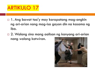 Walang pagkaalipin Artikulo 5. Artikulo 17 Ang bawat taoy may karapatang mag-angkin ng ari-arian nang mag-isa gayon din na kasama ng iba. Karapatang mabuhay maging malaya at magkaroon ng ariarian f Constitutional Rights Mga karapatang ipinagkaloob at pinangangalagaan ng Estado.