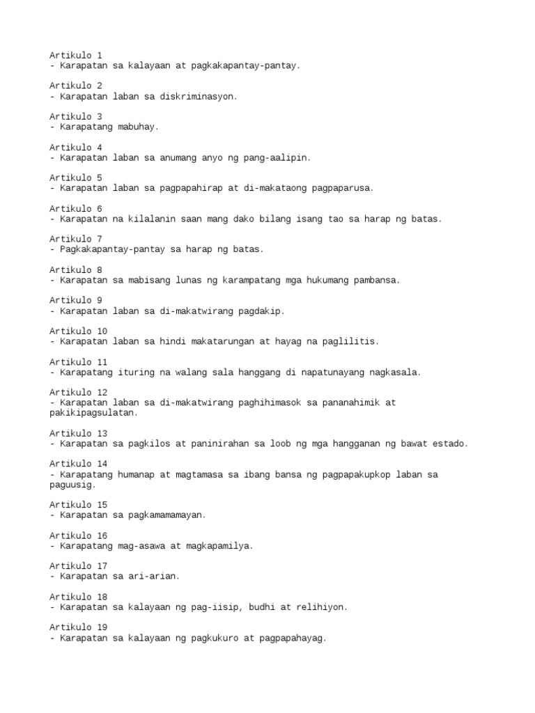 Ang mga Karapatang Pantao sa 30 Artikulo ng UDHR. Ang bawat taoy may karapatan sa pantay na pagp asok sa paglilingkod pambayan ng kanyang bansa. Karapatan sa kalayaan at pagkakapantay-pantay artikulo 18 karapatan sa kalayaan ng pag-iisip budhi at relihiyon artikulo 2 karapatan laban sa diskriminasyon artikulo 19 karapatan sa kalayaan ng pagkukuro at pagpapahayag artikulo 3 karapatang mabuhay artikulo 20 karapatan sa mapayapang pagpupulong at pagsasamahan artikulo 4.