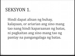 Ang UDHR ay naglalaman ng 30 karapatan pantao na dapat matamasa ng isang tao. Bill of Rights in Tagalog Katipunan ng Mga Karapatan 1987 KONSTITUSYON NG REPUBLIKA NG PILIPINAS ARTIKULO III KATIPUNAN NG MGA KARAPATAN SEKSYON 1. Lady L-Grace Sil Lagdamat.