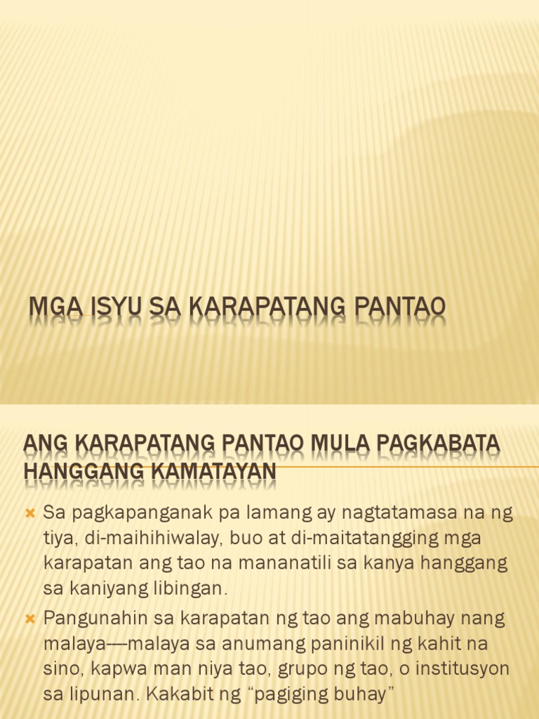 Read MGA ISYU SA KARAPATANG PANTAO by KLIENT ANDREW HALASAN on Issuu and browse thousands of other publications on our platform. DIGNIDAD Kabilang ang lahat ng katangian ng isang tao Kabuhan ng ating pagkatao Mahalaga upang maging ganap ang pagkatao Tinataglay ng bawat tao kaya tayong lahat ay pantay-pantay. BAGO pa ang pagpatay sa 57 katao sa Maguindanao noong Nobyembre 23 malala na ang paglabag sa karapatang pantao.