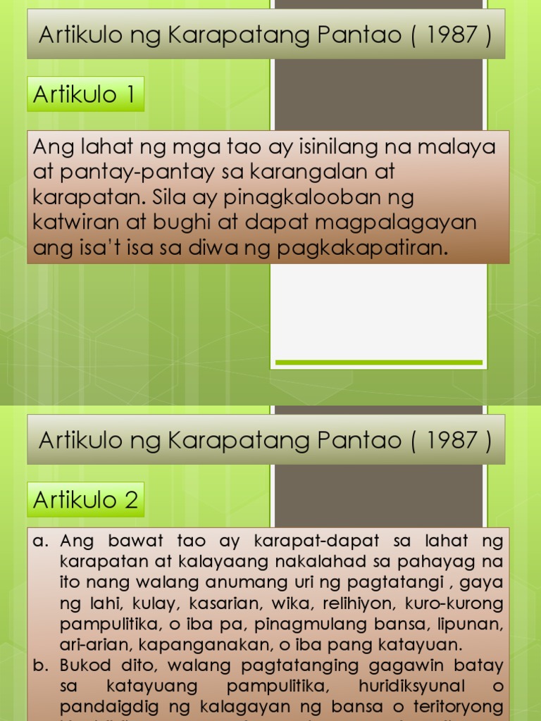 PowToon is a free. Karapatang makilahok sa pamahalaan artikulo 5 karapatan laban sa pagpapahirap at di-makataong pagpaparusa artikulo 22 karapatan sa kapanatagang panlipunan artikulo 6 karapatan na kilalanin saan mang dako bilang isang tao sa harap ng batas artikulo 23 karapatan sa paggawa artikulo 7 pagkakapantay-pantay sa harap ng batas artikulo 24. Hindi dapat magbalangkas ng batas para sa pagtatatag ng relihyon o nagbabawal sa malayang pagsasagamit nito.
