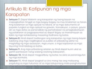 Ang mga bagong artikulo ay naidadagdag linggo-linggo. Sumulat ng paliwanag tungkol sa nilalaman ng bawat seksyon ng Artikulo IV ng Saligang Batas ng Pilipinas. MGA HALIMBAWA NG KARAPATANG PANTAO Kalayaan sa pagsasalita Pagkakapantay- pantay sa harap ng batas Karapatang makapaghanap buhay Karapatan sa pagkain Karapatang makilahok sa kalinangan Karapatan sa edukasyon 4.