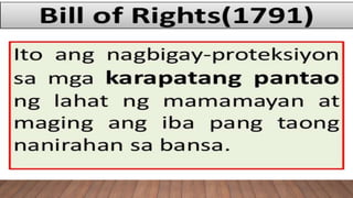 19062015 Makasusuri ng mga uri ng karapatang pantao at makapagbibigay-halimbawa ng mga karapatan sa bawat uri. Isang halimbawa nito ay ang unang sampung susog pagbabago sa Konstitusyon ng Estados Unidos na ipinagtibay noong 1791 at. Ang karapatang pangkatan ay nahahati sa.