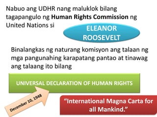 Ang Universal Declaration of Human Rights UDHR ay isa sa mahalagang dokumentong naglalahad ng mga karapatang pantao ng bawat indibiduwalna may kaugnayan sa bawat aspekto ng buhay ng tao. Preamble at Artikulo 1 inilahad ang likas na karapatan ng lahat ng tao tulad ng pagkakapantay-pantay at pagiging malaya. Kabilang sa mga ito ang karapatang sibil politikal ekonomiko sosyal at kultural - pilapil velasco - universal declaration of human rights udhr nang itatag ang united nations noong oktubre 24 1945 binigyang-diin ng mga bansang kasapi nito na magkaroon ng kongkretong balangkas upang matiyak na maibabahagi ang kaalaman at maisakatuparan.