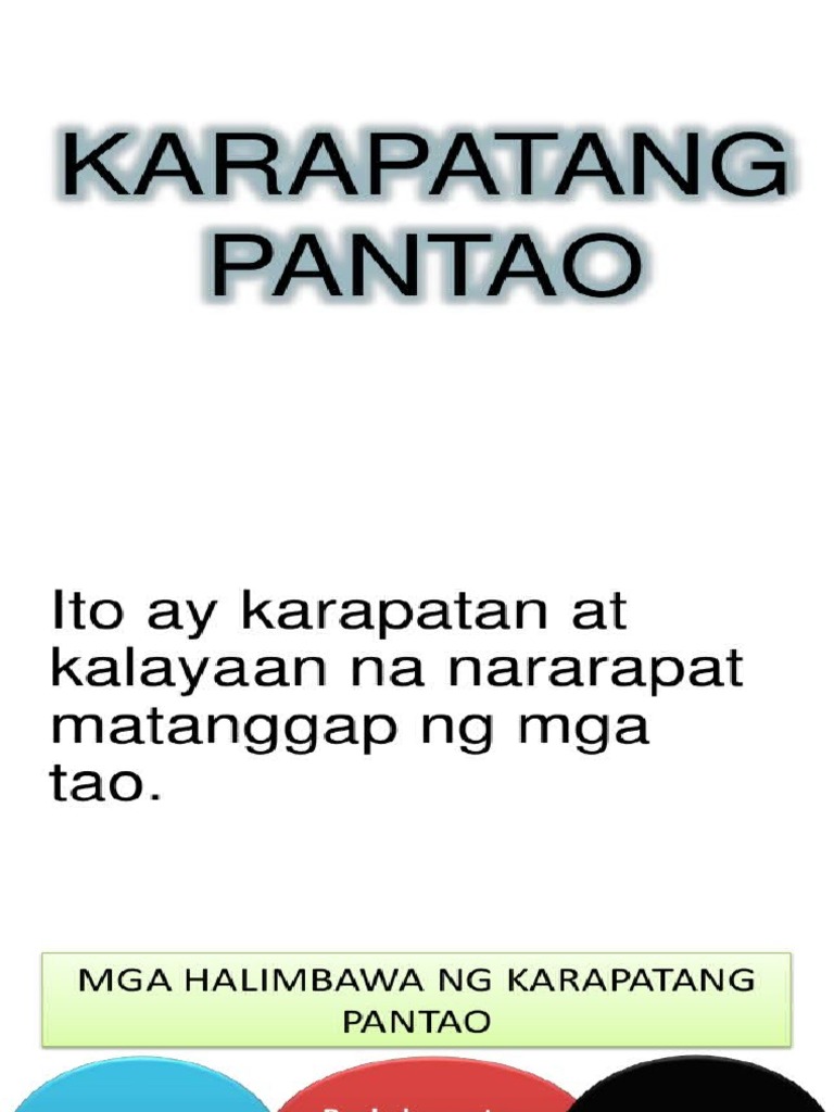 Ang mga karapatang pantao ay may malaking maitutulong upang mabigyan ka ng proteksyon laban sa mga tao o grupo ng taong nais mang-api at magsamantala. See more of Karapatang Pantao on Facebook. FIRST VID ELLA KARAPATANG PANTAO HUMAN RIGHTS - - - -tumutukoy sa mga pamantayan na.