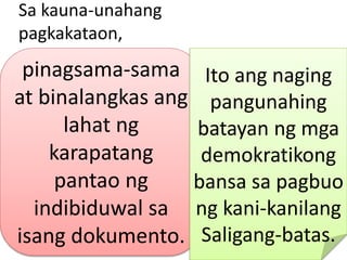Bilang pangkalahatang pamantayang maisasagawa para sa lahat ng tao at bansa sa layuning ang bawat tao at bawat galamay ng lipunan na laging nasa isip ang pahayag na ito ay magsikap sa pamamagitan ng pagtuturo at edukasyon na maitaguyod ang paggalang sa mga karapatan at kalayaang ito at sa pamamagitan ng mga hakbang na pagsulong na pambansa at. MGA BATAYAN NG KARAPATANG PANTAO Magna Carta Naipasa ito ni Haring John ng Inglatera noong 1215. Pagkakabuo ng karapatang pantao magna carta cyrus cylinder petition of right bill of rights the first geneva convention declaration of the rights of the man and of the citizen.