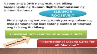 Mga Karapatang Pantao Human Rights karapatang mamuhay right to live kalayaan sa pagsasalita freedom of speech pagkakapantay-pantay sa harap ng batas equality before the law mga panlipunang karapatan social rights mga pangkalinangang karapatan.
