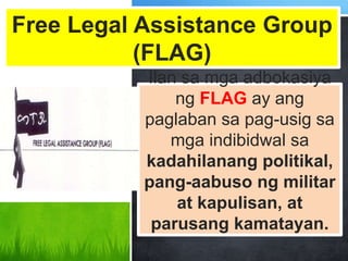 Ito ay isang pambansang grupo ng mga human rights lawyer na nagtataguyod at nangangalaga ng mga karapatang pantao. Daigdig ang binuo upang itaguyod ang mga karapatang. F Maraming organisasyon sa ibat ibang panig ng.