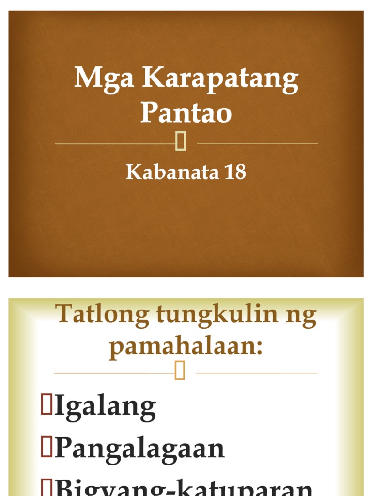 4th Q-Modyul 2-Mga Karapatang Pantao. 2 MODYUL 24 KARAPATANG PANTAO Isang pagbati. Karaniwang naiintindihan ang mga ito bilang di-mabilang pangunahing mga karapatan kung saan ang isang tao ay likas na may karapatan.