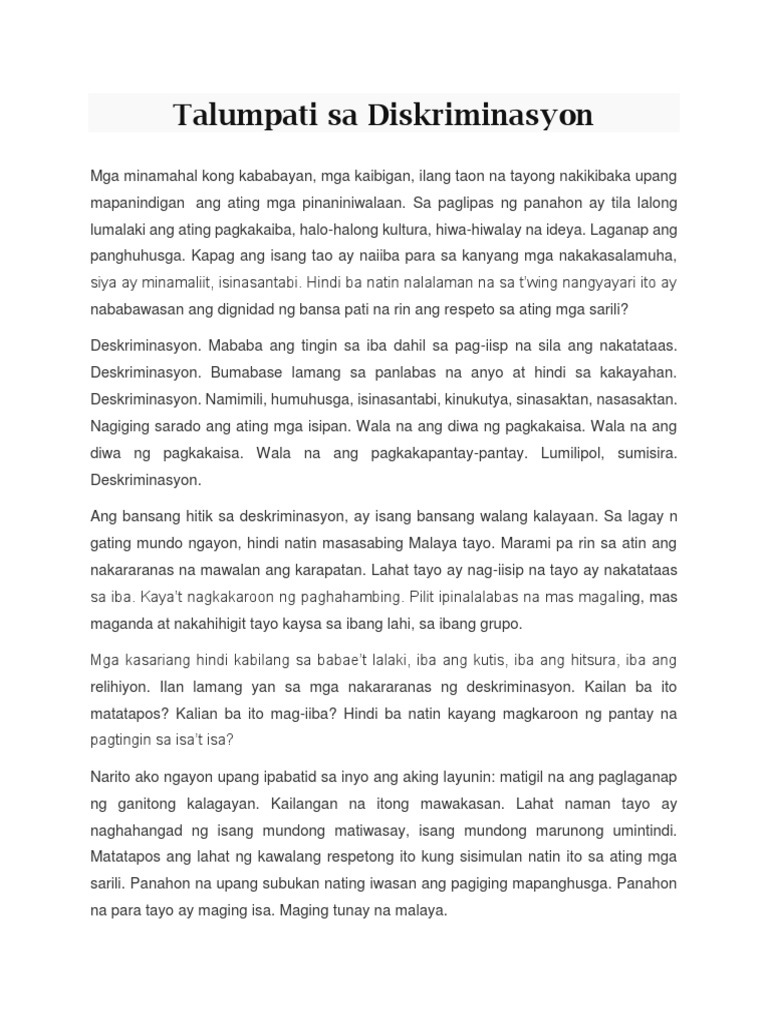 Talumpati Docx Pagbati Sainyong Lahat Ang Talumpating Ito Ay Patungkol Sa Karapatang Pantao Sa Unang Yugto Pa Lamang Ng Ating Buhay Sa Daigdig Ay Course Hero